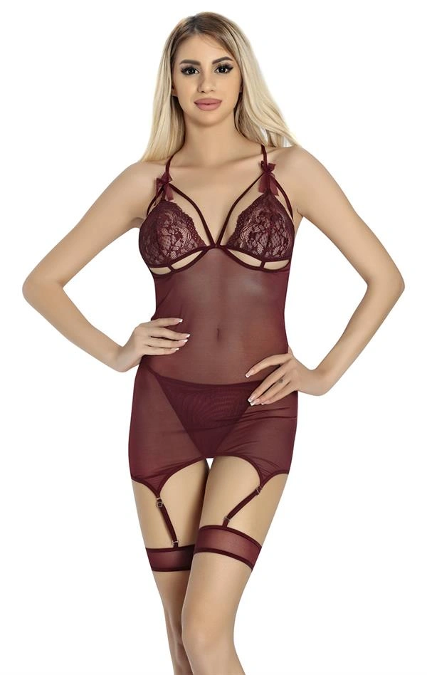 Amora Secret Kadın Fantazi İç Giyim Bordo Dantel İşlemeli Göğüs İp Detaylı Fantezi Jartiyer Takımı - Şehvetli ve Zarif Tasarım
