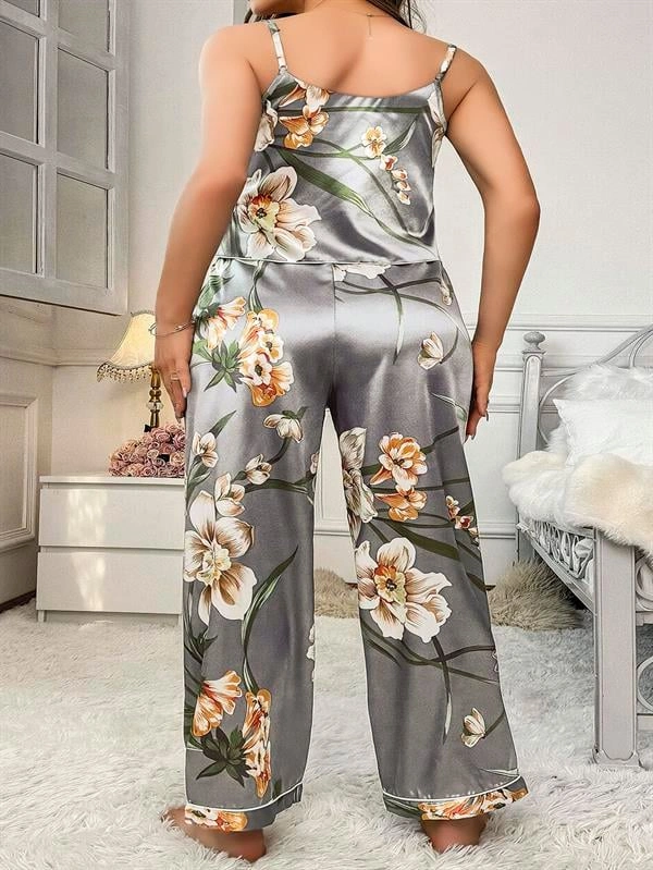 Amora Secret Kadın Fantazi İç Giyim Büyük Beden Çiçek Desenli İnce Askılı Gri 2'li Takım - Şehvetli ve Zarif Tasarım