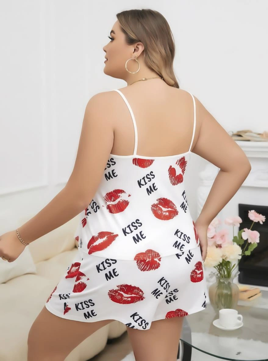 ?? Tatlı Bir Dokunuşla Geceye: Büyük Beden Kiss Me Öpücük Desenli Pamuklu Şortlu Pijama Takımı ?