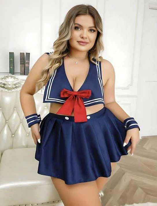 AmoraSecret AmoraSecret Büyük Beden Lacivert Büstiyerli Kurdela Detaylı Mini Etekli Fantezi Denizci Kostümü