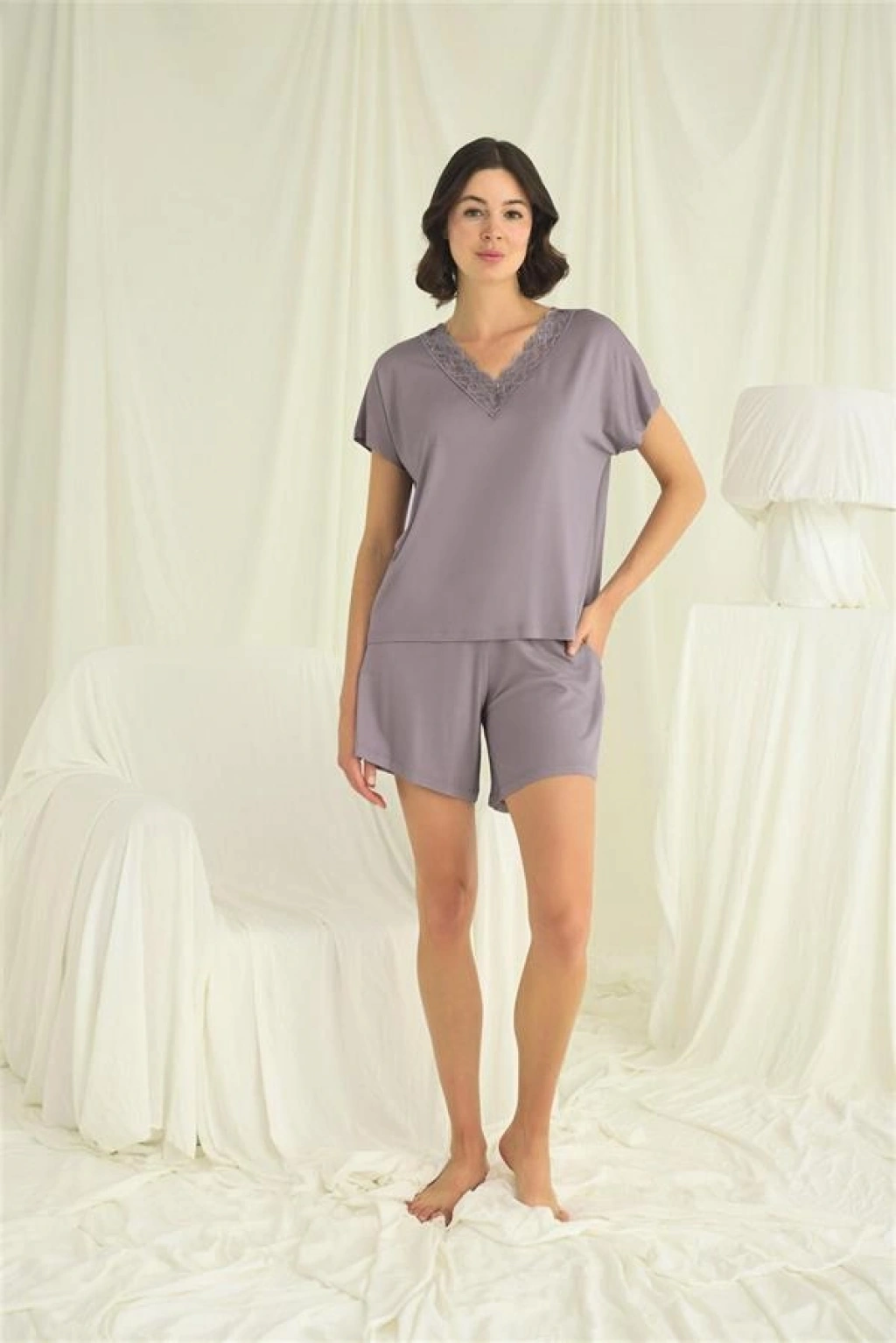 Amora Secret Kısa Kollu Dantelli V Yaka Şort Takımı Kadın İç Giyim Zarif Görünüm