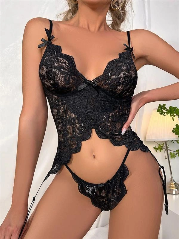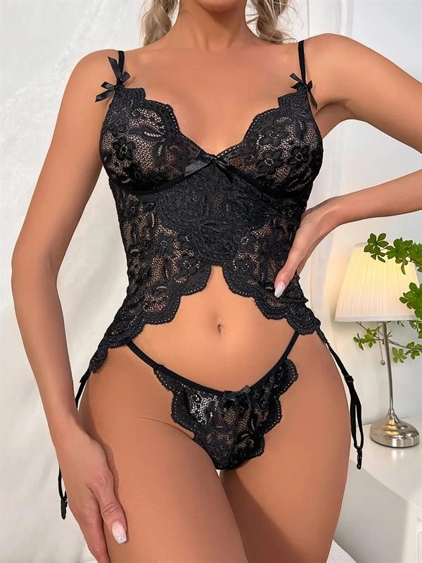 Amora Secret Kadın Fantazi İç Giyim Özel Tasarım Arkadan Bağcıklı Fantezi Siyah Jartiyer Takım - Şehvetli ve Zarif Tasarım