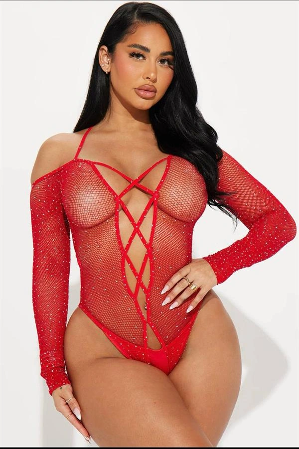 Amora Secret Kadın Fantazi İç Giyim Özel Tasarım Kırmızı Taşlı Fantezi Vücut Çorabı - Şehvetli ve Zarif Tasarım