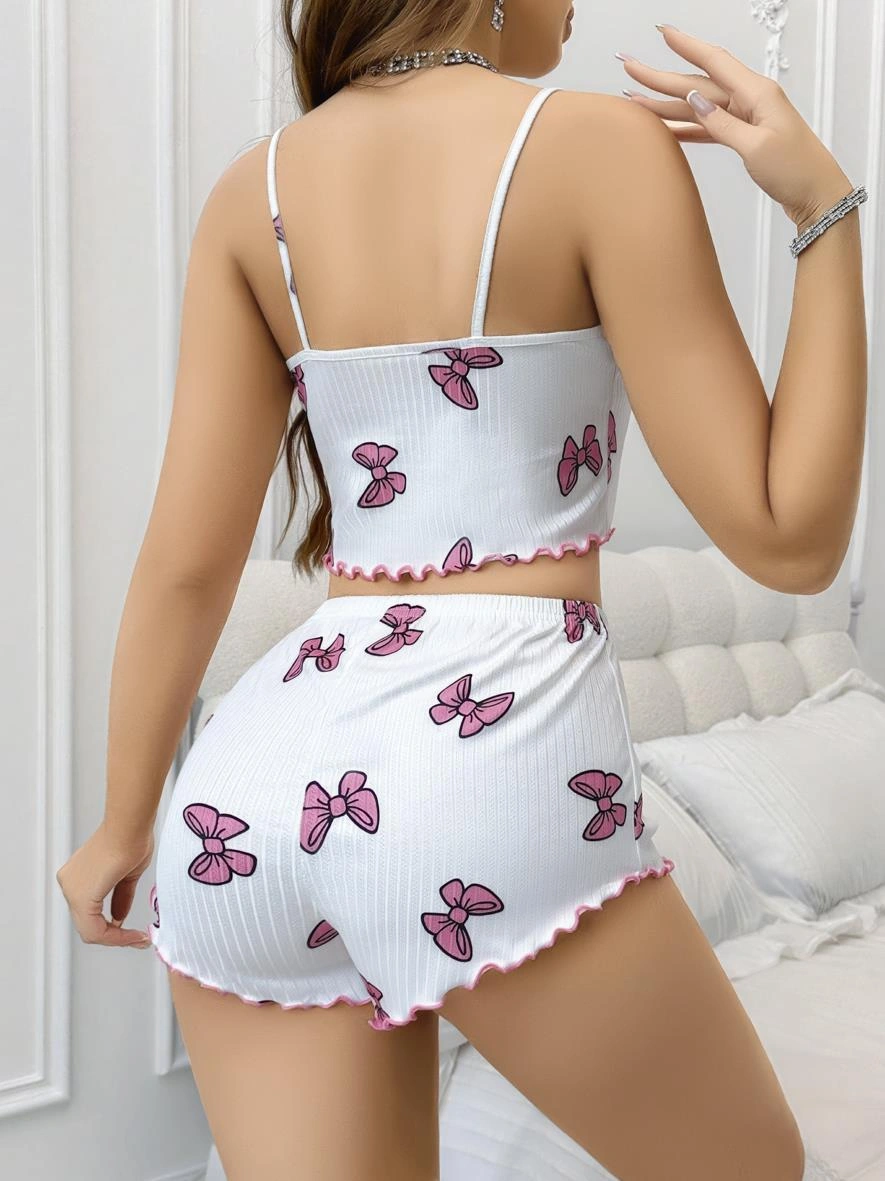 Yumuşacık pamuklu kumaşı ve fitilli dokusuyla konforu ön planda tutan bu pijama takımı, beyaz zemin üzerindeki pembe kurdele desenleriyle zarif ve feminen bir görünüm sunar. İnce askılı üstü ve elastik bel şortu ile yaz akşamlarınızın rahatlığına şıklık katıyor.