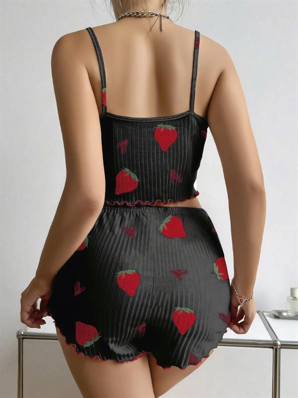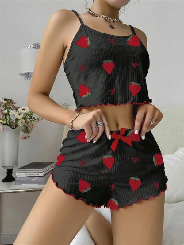 Amora Secret Kadın Fantazi İç Giyim Pamuklu Siyah Üstüne Çilek Desen Fitilli Askılı Şortlu Pijama Takımı - Şehvetli ve Zarif Tasarım