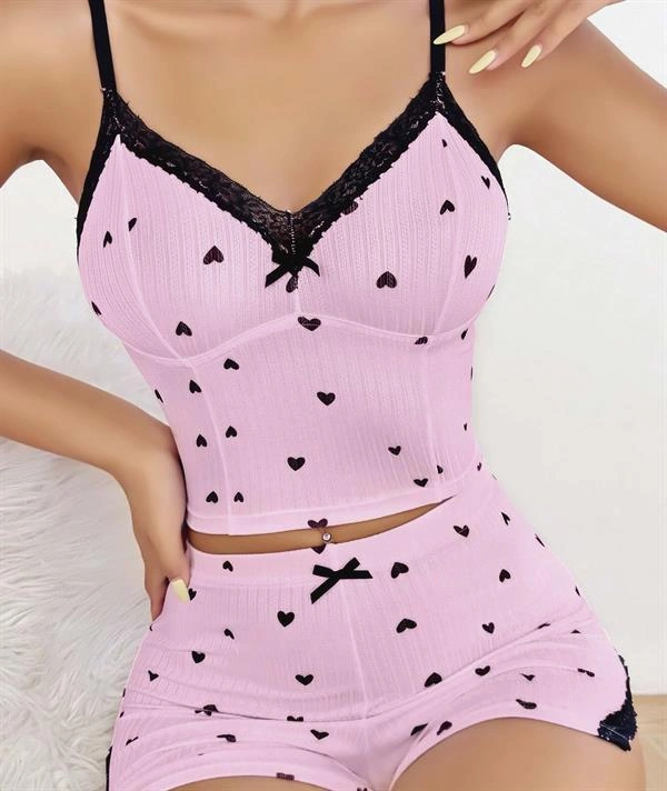 Amora Secret Kadın Fantazi İç Giyim Pembe Kalp Desenli Askılı Şortlu Pijama Takım - Şehvetli ve Zarif Tasarım