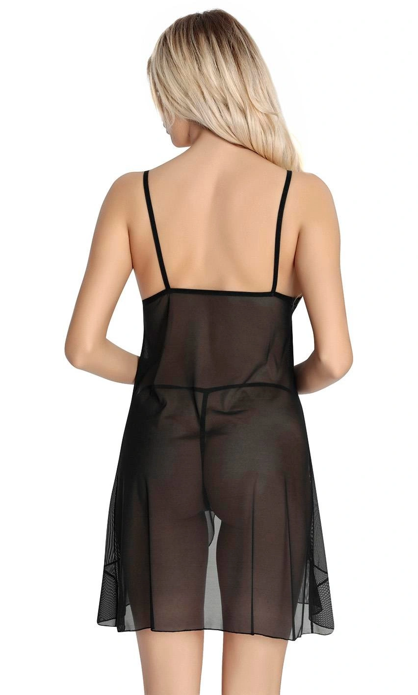 ? Siyah Dantel İşlemeli Göğüs İp Detaylı Fantezi Tül Gecelik ?