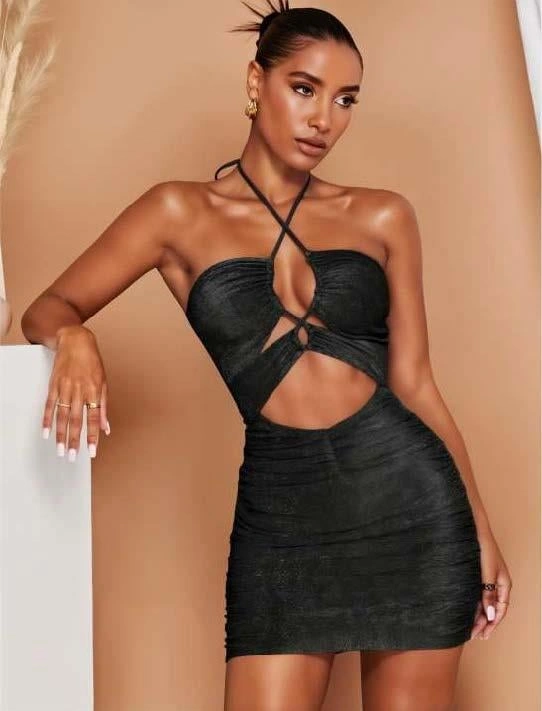 AmoraSecret AmoraSecret Siyah Simli Boyundan Bağlamalı Göğüs Dekolteli Mini Club Elbisesi