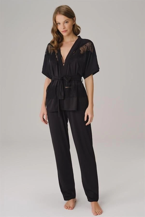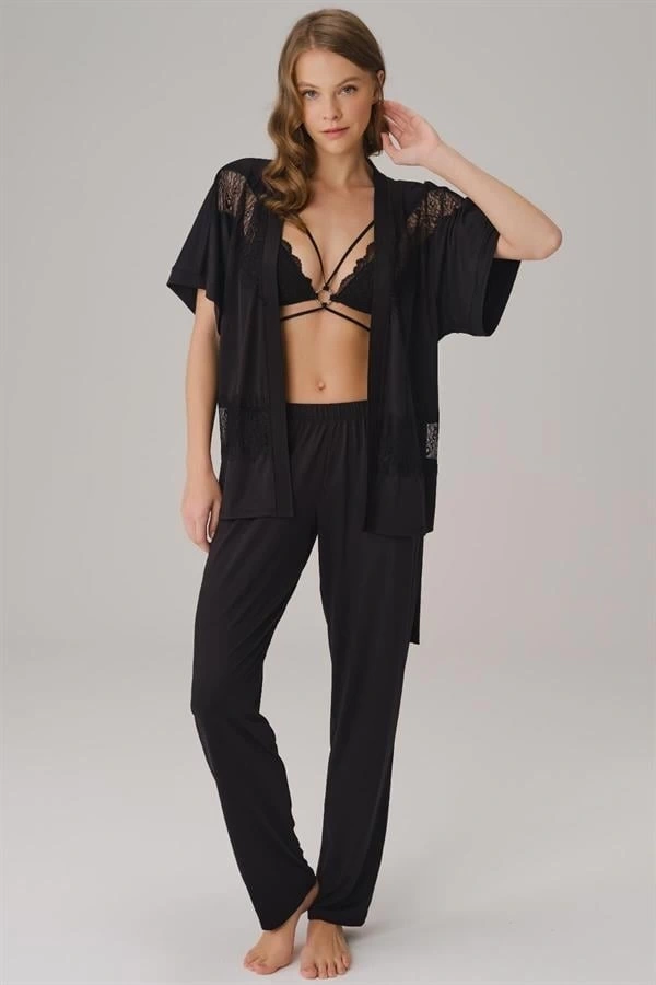 AmoraSecret AmoraSecret Dantelli Sabahlık Balensiz Desteksiz Dolgusuz Yaka Detaylı Sütyen ve Pantolon Pijama 3'lü Takım