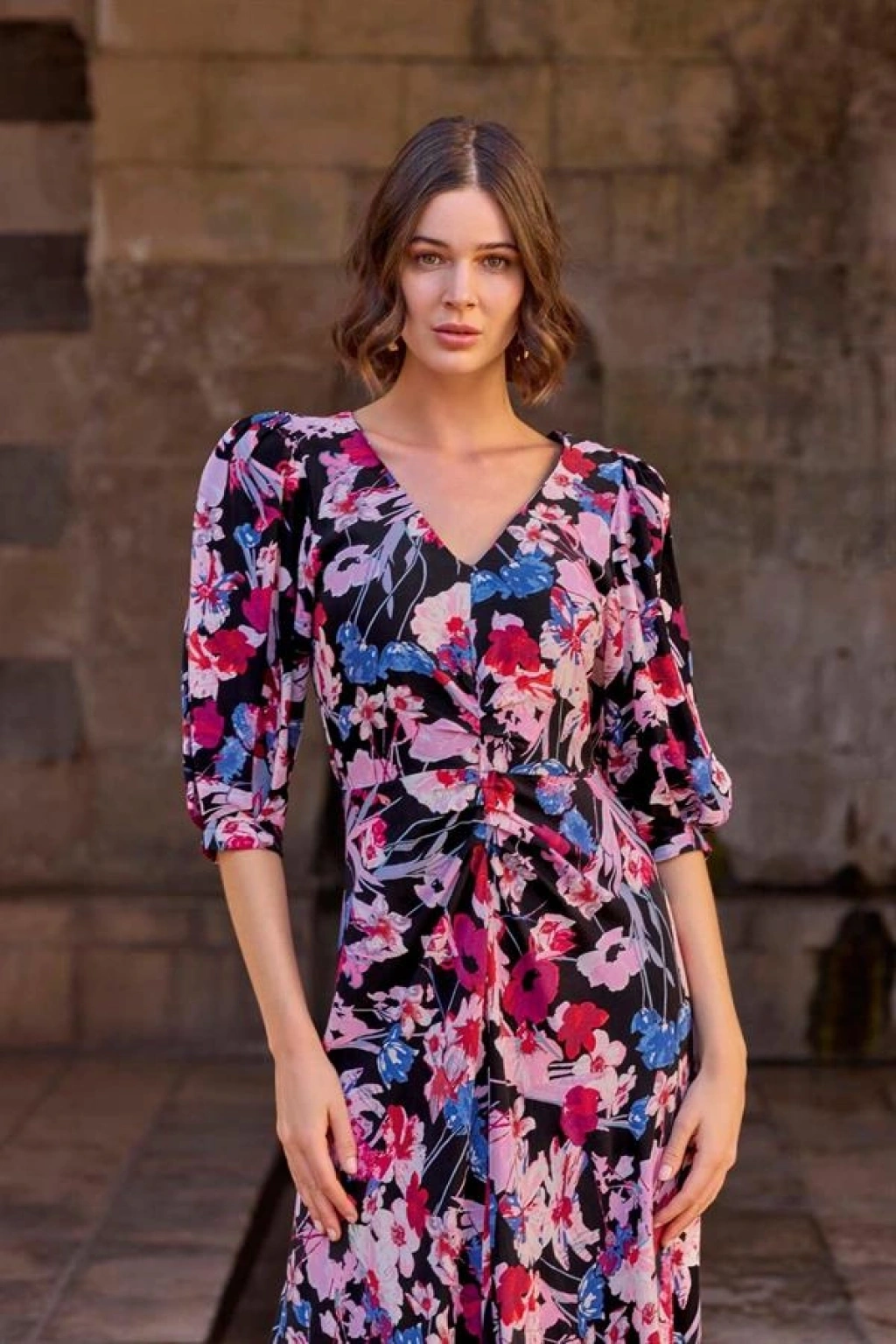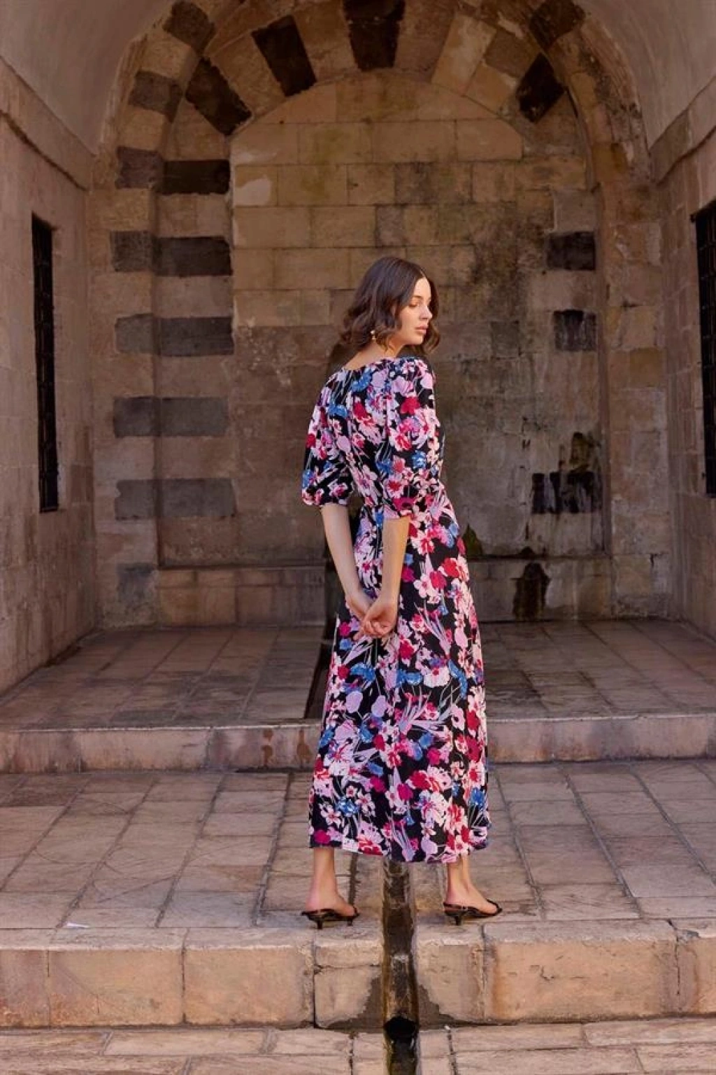 Elbise: Siyah zemin üzerine çiçek desenlidir, V yakalıdır, truvakar kolludur, dokuma kumaştır.