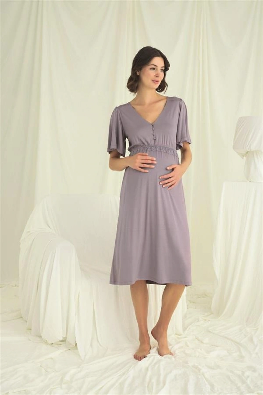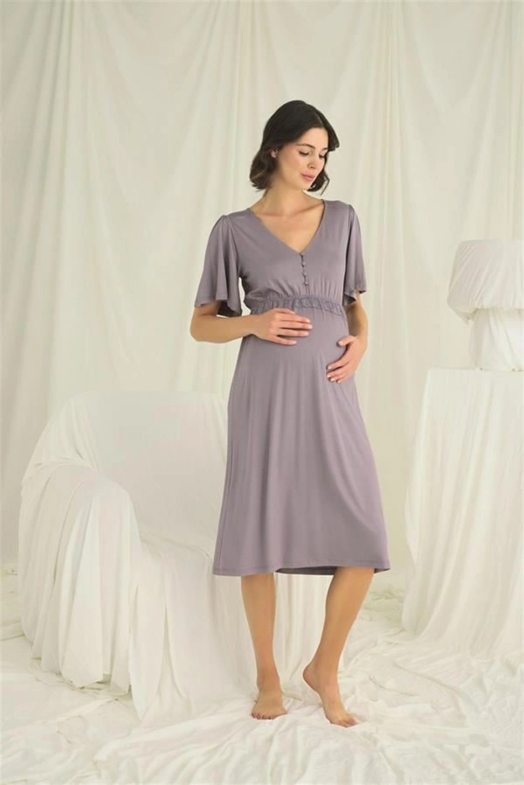 Gecelik: Gri renklidir, V yakalıdır, kolu ve beli dantellidir, yakasının altı düğmelidir, emzirme için düğmelerden açılır durumdadır, kısa kolludur, örme kumaştır.