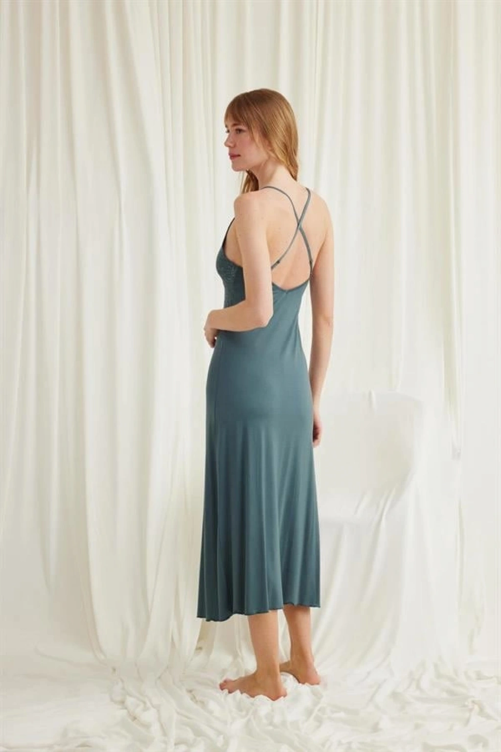 Gecelik: Yeşil renklidir, derin V yakalıdır, göğüs ve sırt dekoltelidir, yakası, göğsü ve göğüs altı dantellidir, ayarlanabilir lastik askılıdır, yırtmaç detaylıdır, örme kumaştır.