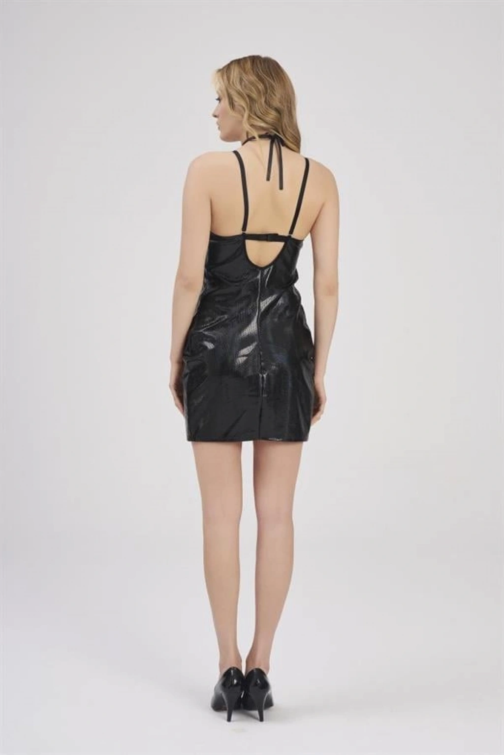 Vahşi cazibenin simgesi olan yılan deseni, deri dokunun iddialı duruşuyla buluşuyor. Bu yılan desenli deri elbise; vücuda oturan kesimi ve dikkat çekici deseniyle güçlü, cesur ve baştan çıkarıcı bir stil sunar.