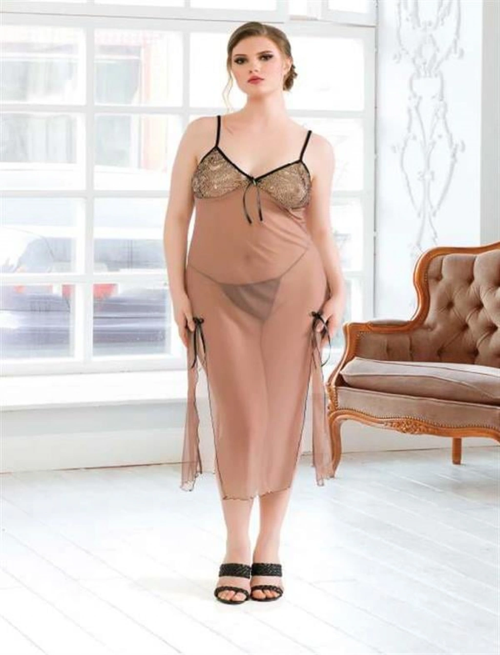 ÖZEL TASARIM BÜYÜK BEDEN KAHVERENGI TÜL FANTEZI UZUN YIRTMAÇLI GECELIK