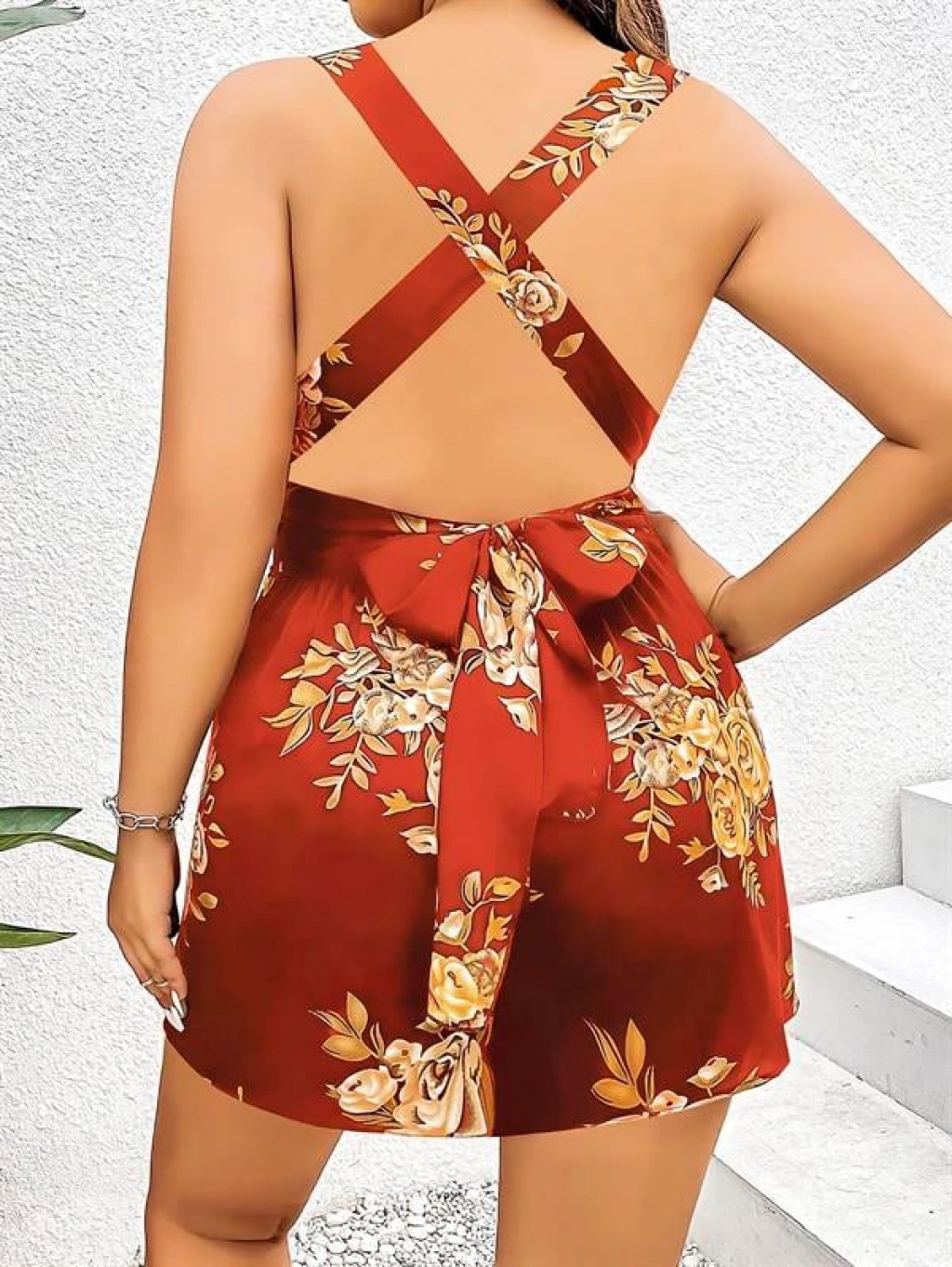 ÖZEL TASARIM BÜYÜK BEDEN KAHVERENGI ÜSTÜNE ÇIÇEK DESENLI SIRT DETAYLI ELBISE