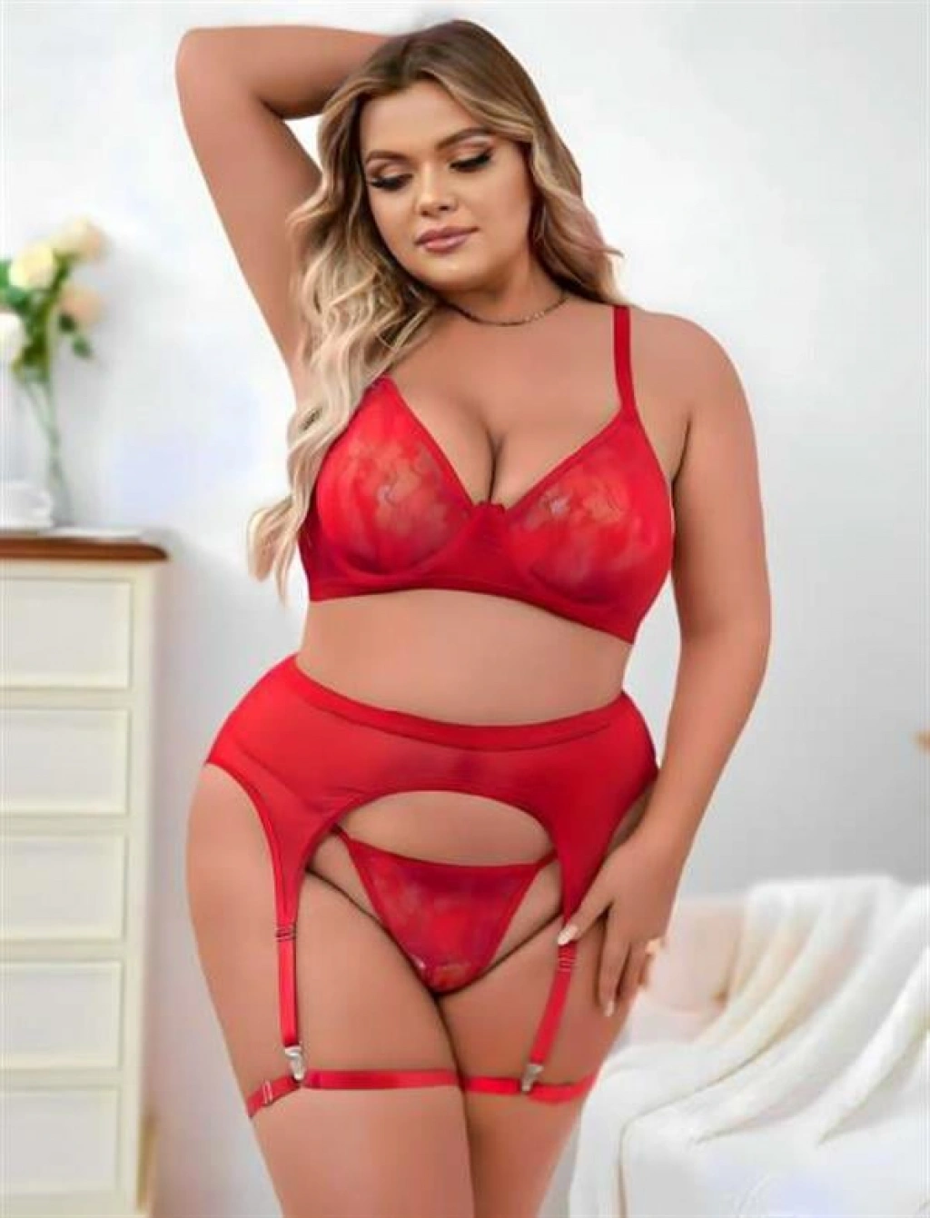 ÖZEL TASARIM BÜYÜK BEDEN KIRMIZI DANTEL İŞLEMELI FANTEZI JARTIYER TAKIMI