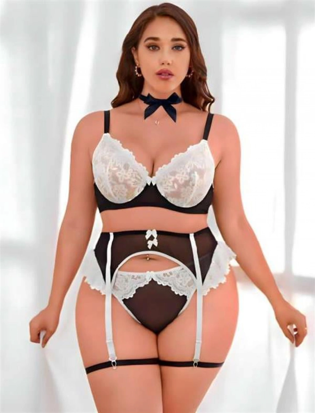 ÖZEL TASARIM BÜYÜK BEDEN SIYAH BEYAZ DANTEL İŞLEMELI FANTEZI JARTIYER TAKIMI
