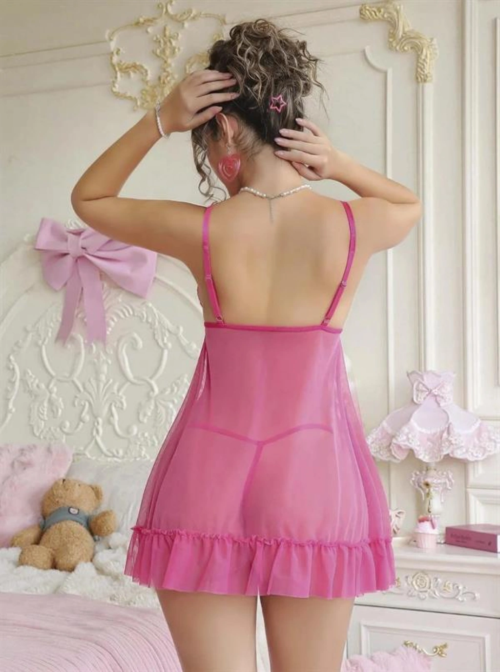 ÖZEL TASARIM FUŞYA DANTEL İŞLEMELI GÖĞÜS DEKOLTELI FIYONKLU FANTEZI STRING TÜL GECELIK TAKIMI