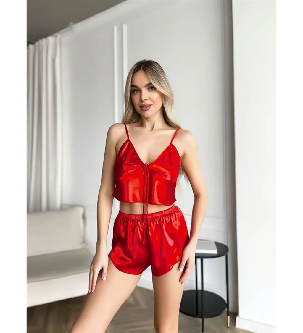 ÖZEL TASARIM KIRMIZI İNCE ASKILI SATEN ŞORTLU TAKIM