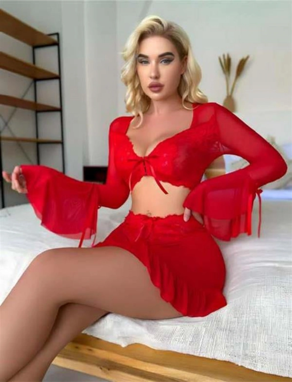 ÖZEL TASARIM KIRMIZI TRANSPARAN FANTEZI ETEKLI GECELIK TAKIM