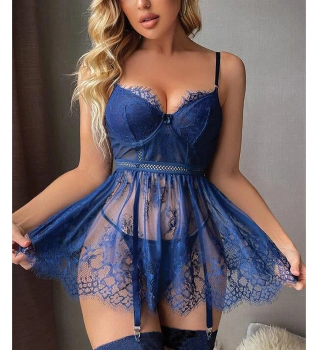ÖZEL TASARIM MAVI DANTEL İŞLEMELI JARTIYERLI GECELIK TAKIMI
