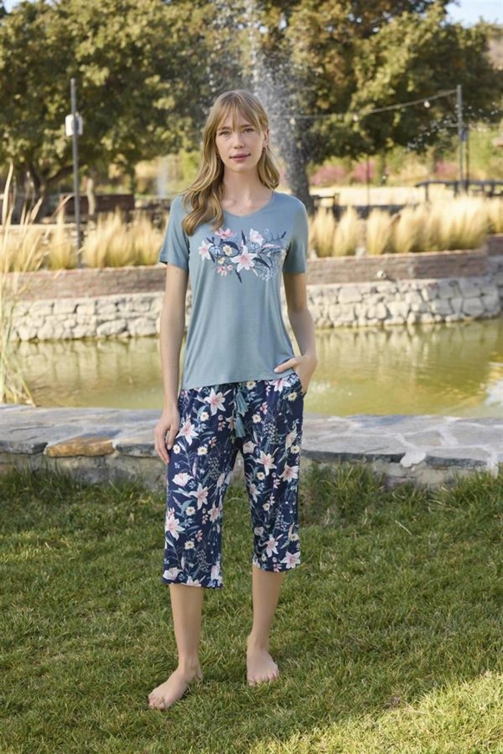 Üst: Yeşil renklidir, bisiklet yakalıdır, kısa kolludur, çiçek ve yaprak baskılıdır, örme kumaştır.