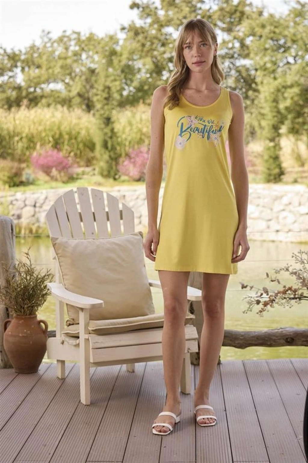 Gecelik: Sarırenklidir, oyuk yakalıdır, kalın askılıdır, çiçek ve yaprak baskılıdır, "You are Beautiful" yazılıdır, örme kumaştır.