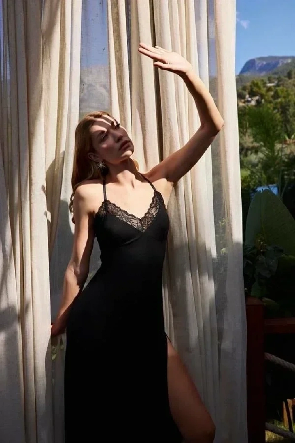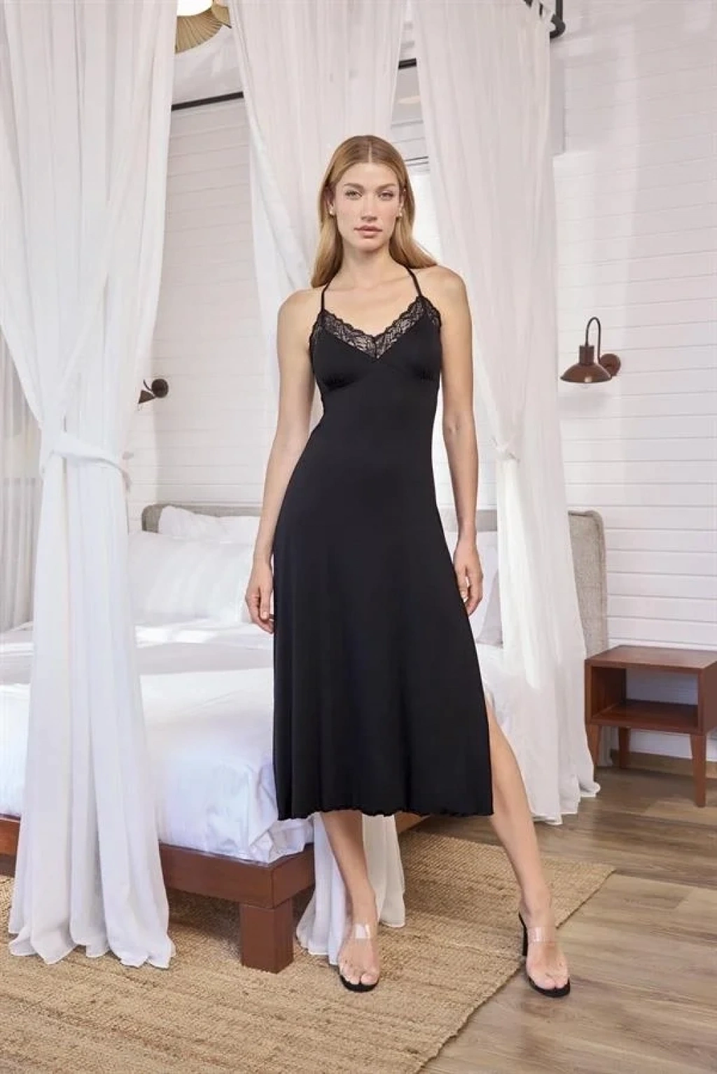 Gecelik: Siyah renklidir, derin V Yakalıdır, göğüs ve sırt dekoltelidir, ayalanabilir ip askılıdır, yakası ve göğüs kenarları ile sırtı dantellidir, yırtmaçlıdır, örme kumaştır.