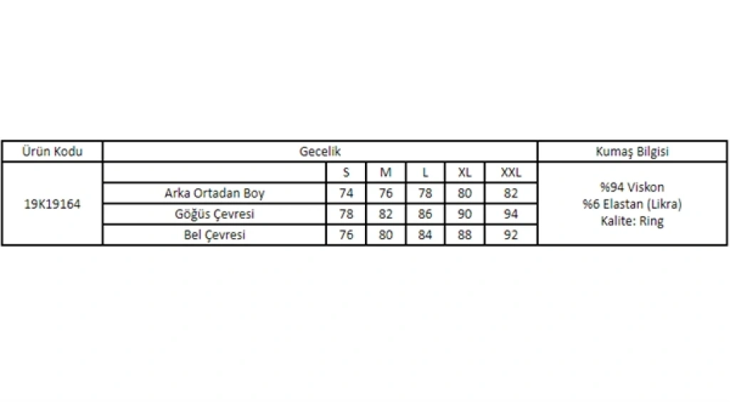 Gecelik: Ayarlanabilir ip askılıdır, derin V yaka dekoltelidir, ekru renklidir, göğüs ve göğüs altı brode dantellidir, örme kumaştır. Materyal %94 Viskon %6 Elastan