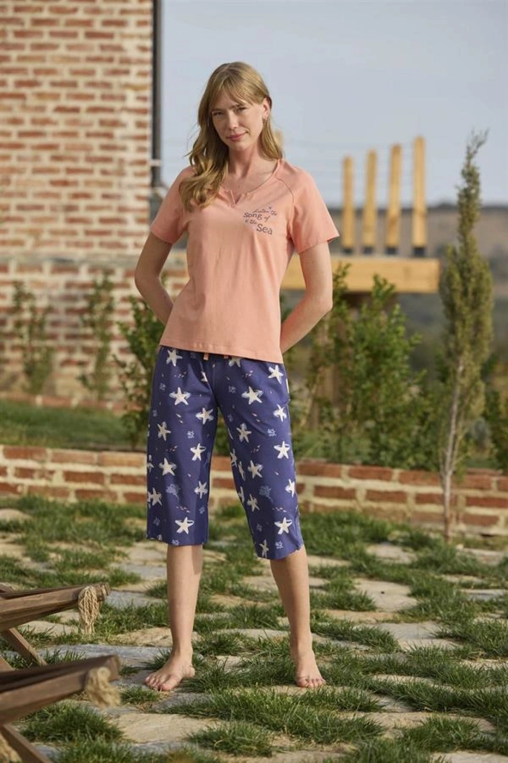 Üst: Yavruağzı renklidir, bisiklet yakalıdır, kısa kolludur, deniz yıldızı baskılıdır, "Listen the Song of the Sea" yazılıdır, örme kumaştır.