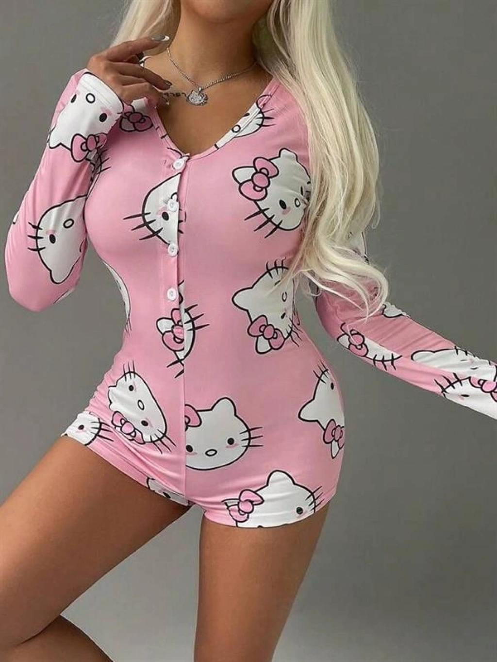 Sevimli Hello Kitty desenleri ve yumuşak pembe tonu ile ev stiline neşe katan bu tulum pijama, pamuklu dokusu sayesinde gün boyu rahatlık sunar. Uzun kollu yapısı serin havalarda sıcak tutarken, tek parça formu ile konforlu bir kullanım sağlar.