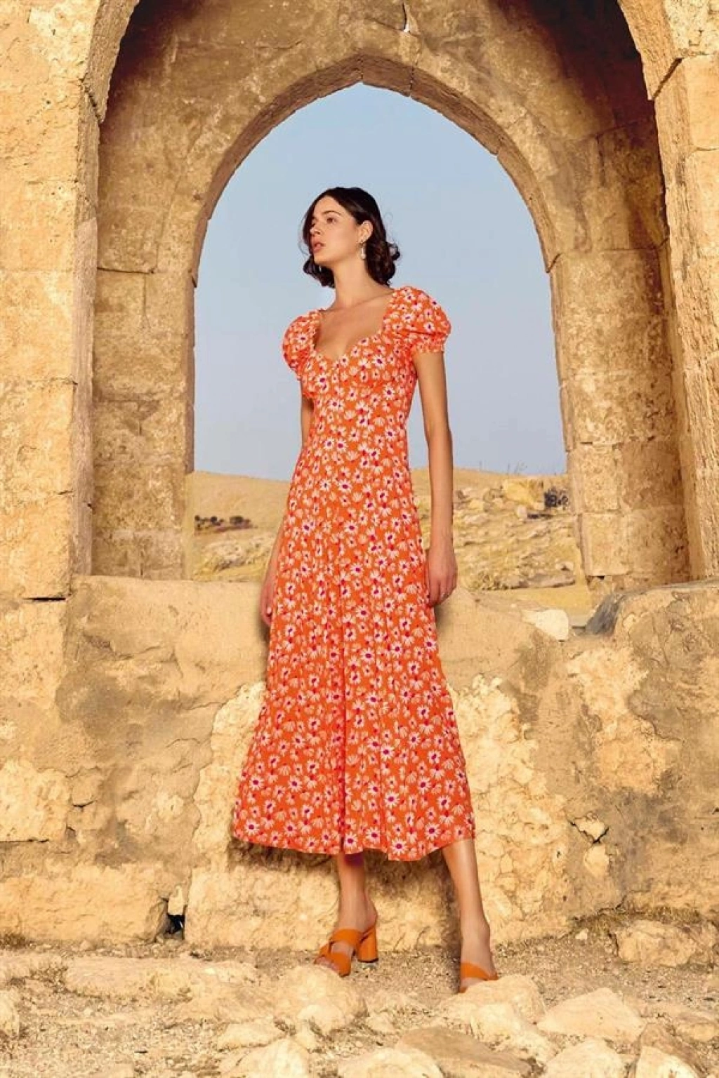 Elbise: Turuncu zemin üzerine çiçek desenlidir, derin V yaka dekoltelidir, kısa kolludur, kol ağzı lastiklidir, dokuma kumaştır.