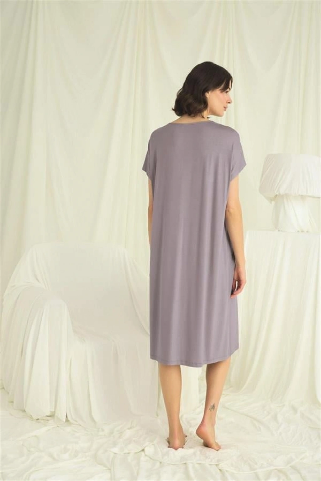 Gecelik: V yakalıdır, kısa kolludur, yakası dantellidir, Gri renklidir, örme kumaştır.